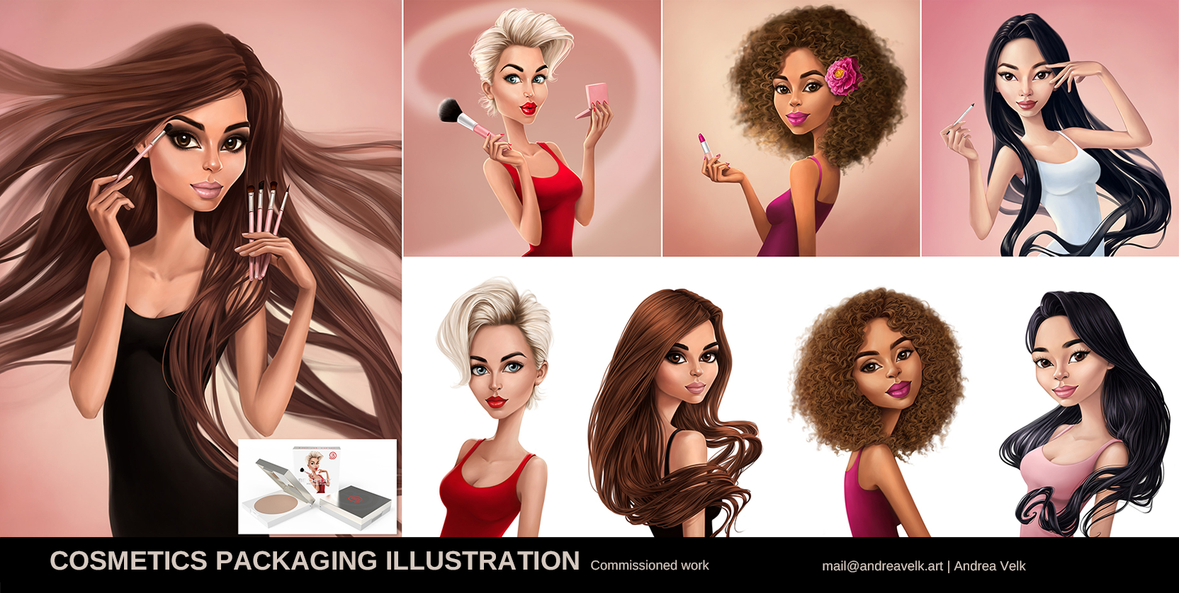 I created full-color illustrations and visual variations of concepts, poses, and expressions for a vegan makeup line launched in the UK.