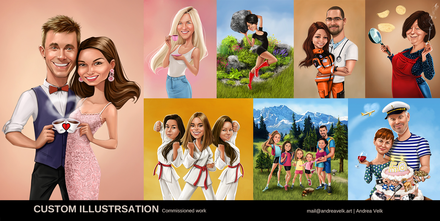 I create custom illustrations based on my clients’ ideas, bringing their stories and concepts to life through expressive, colorful artwork. Commissions are available in the Shop section.